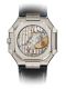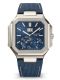 Das markante, eckige Gehäuse mit 45 mm Durchmesser wirkt schlank und elegant, veredelt durch den Kontrast von polierten und vertikal satinierten Finissierungen. Auf der Platinlünette befindet sich bei 6 Uhr ein Baguette-Diamant, der der Uhr zusätzlichen Glanz verleiht. Der moderne, lässige Chic wird durch ein marineblaues Armband aus Verbundmaterial mit Textilmotiv hervorgehoben, das die Uhr gekonnt in Szene setzt.