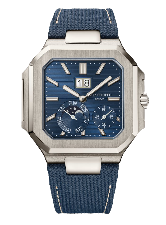 Patek Philippe eröffnet seine neue Cubitus Kollektion, in der Kühnheit und Eleganz verschmelzen, mit einem Modell, das neue Anzeigen bietet. Die Uhr kombiniert ein Großdatum mit augenblicklichen Wochentags- und Mondphasenanzeigen.