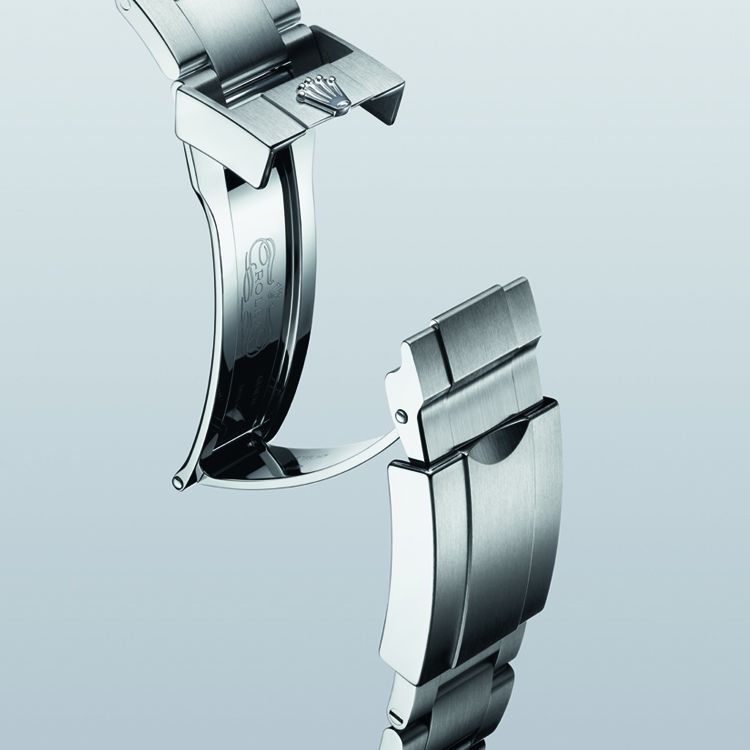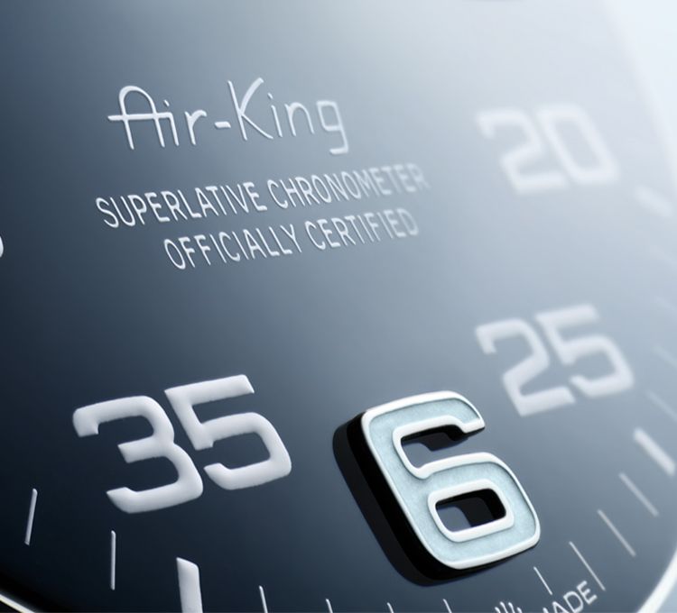 Die aktuelle Air-King besticht durch ein schwarzes Zifferblatt mit vergrößerten Ziffern bei 3, 6 und 9 Uhr und eine markante Minutenskala zum optimalen Ablesen der Navigationszeiten. Die Krone, das Rolex Markenzeichen, prangt in Gelb auf dem Zifferblatt, während sich der Sekundenzeiger sowie der Name „Rolex“ – in Anlehnung an die legendäre Rolex Farbe – in Grün präsentieren. Das Modell ist leicht zu erkennen an dem charakteristischen Schriftzug, in dem der Name „Air-King“ seit Einführung der Armbanduhr im Jahre 1958 erscheint.