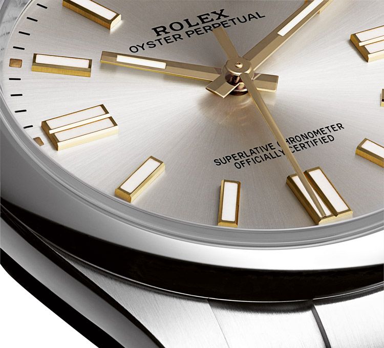 Die Oyster Perpetual bietet eine klare und präzise Anzeige der Stunden, Minuten und Sekunden. Die verschiedenen Versionen der Armbanduhr gefallen mit Zifferblättern in subtilen oder leuchtenden Farben, ob in raffiniertem Silber, strahlend blau oder strahlend schwarz mit Radialschliff oder lackiert in auffälligem Candy pink, Türkisblau oder Grün. Die Oyster Perpetual verfügt über die umfangreichste Auswahl an Größen unter den Rolex Modelllinien: 28, 31, 34, 36 und 41 mm.