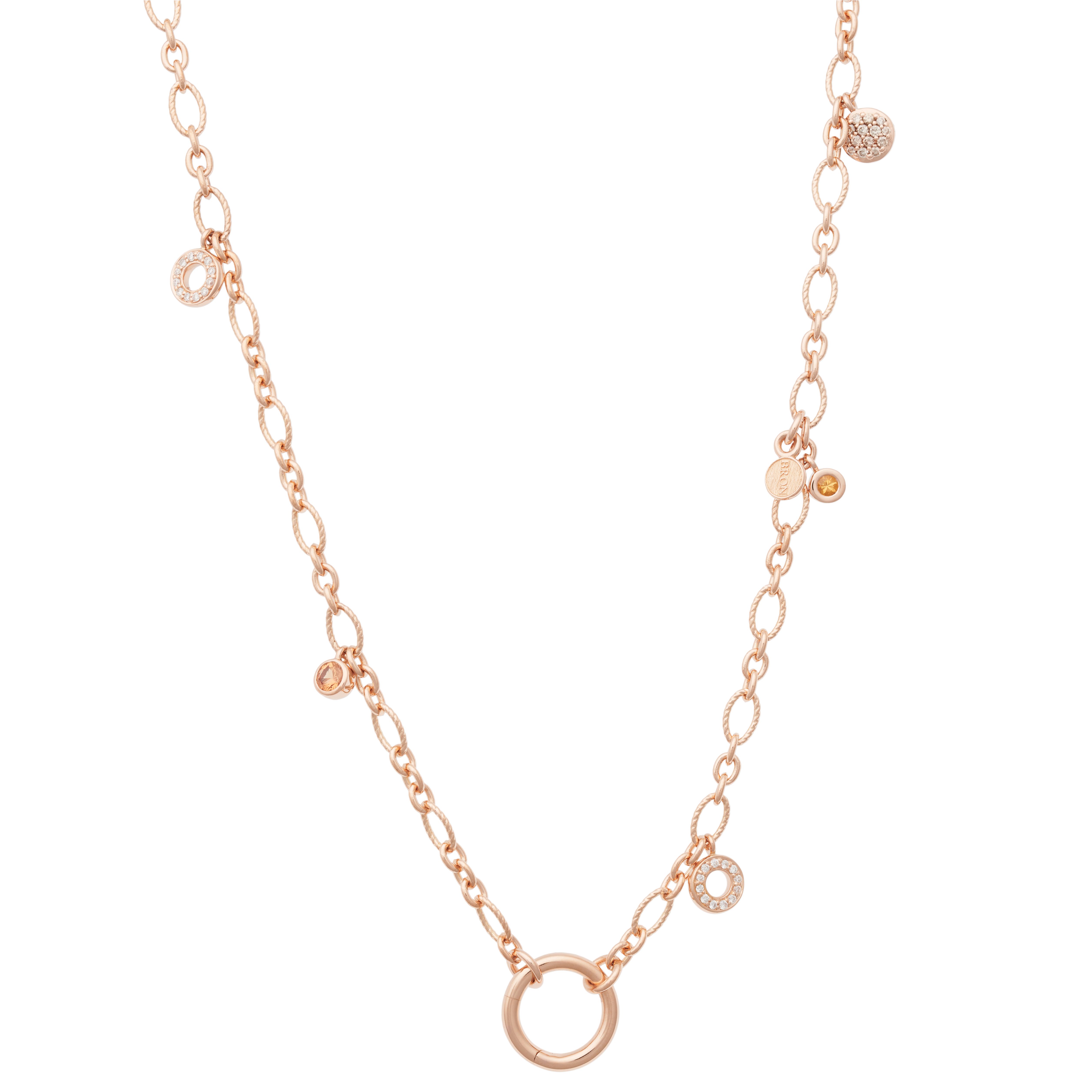 Das verschlungene Collier mit massiven Goldgliedern, ist verziert mit Mini-Anhängern aus Diamanten und Saphiren. Verwenden Sie den Klickring für Ihren Lieblingsanhänger.