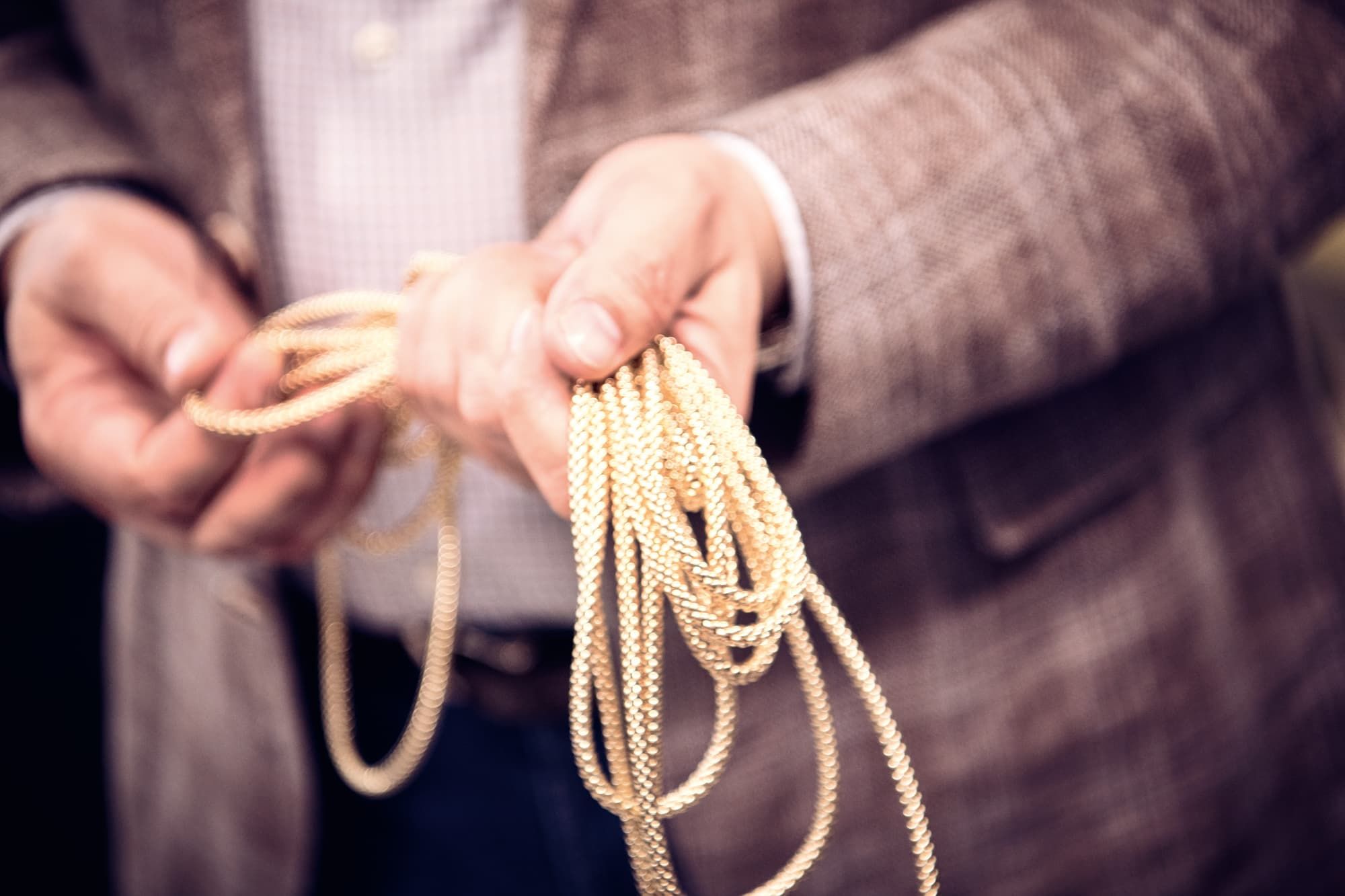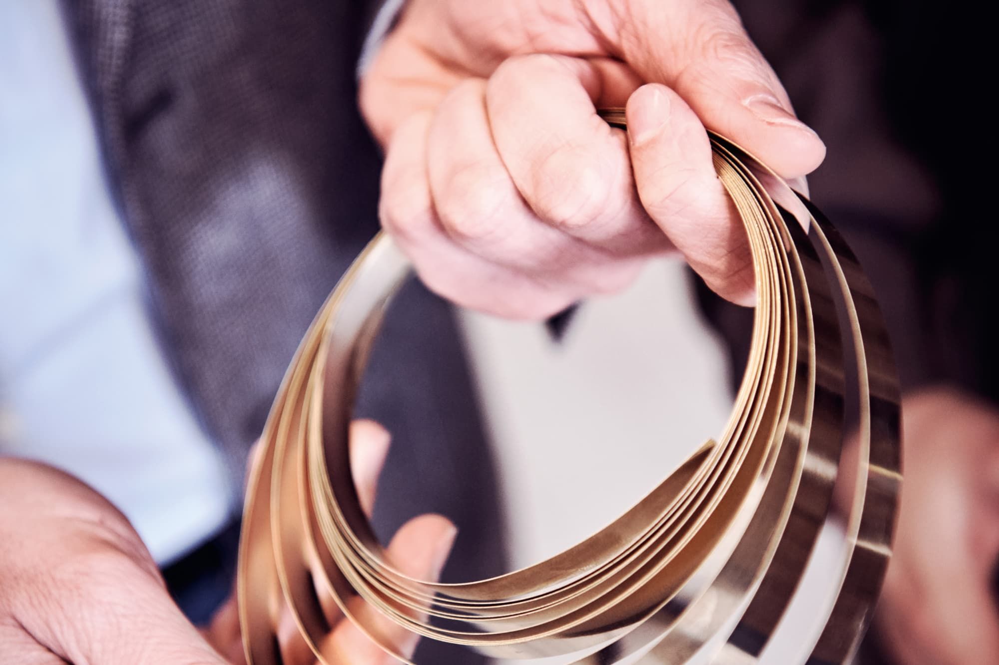 „Jede einzelne Komponente, selbst die winzigen Federn, besteht aus 18-karätigem Gold“, erklärt Giuseppe Marcheluzzo. „Flex’it kommt komplett ohne Schweißnähte aus: Die einzelnen Teile werden ausschließlich mechanisch zusammengesetzt.“ Diese patentierte Technik sorgt dafür, dass die Armbänder und Ringe schön flexibel sind und sich ohne Verschluss einfach über das Handgelenk bzw. den Finger rollen lassen. An der ersten Station unserer Führung werden wir dank eines Mitarbeiters zum ersten Mal ins Staunen versetzt. Greift er doch einfach hinter sich, zaubert ein zusammengelegtes meterlanges Goldband hervor und legt es uns in die Hände: die Basis der Flex’it-Kollektion, aus purem 18-karätigen Gold gefertigt und trotzdem unerwartet schwer.