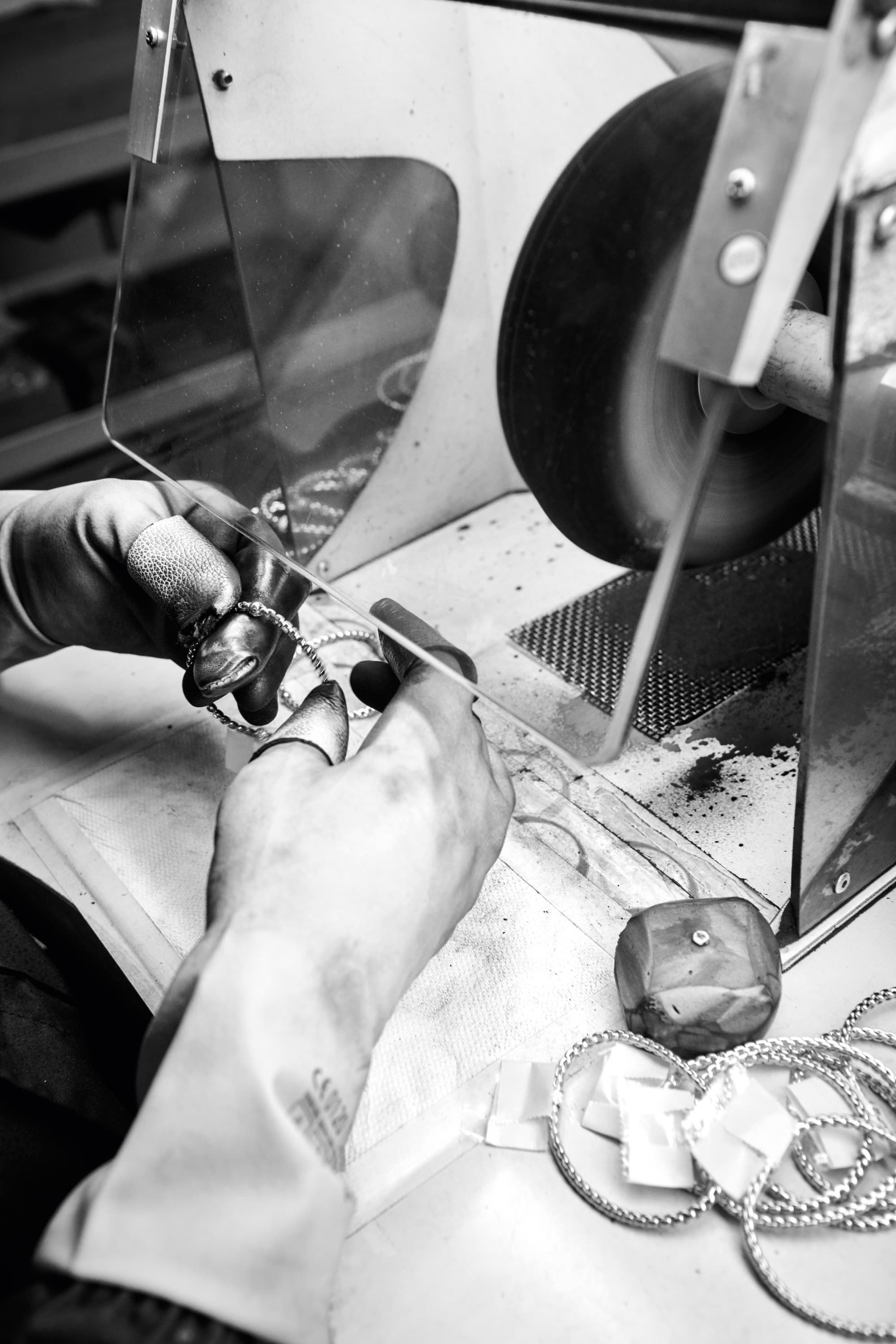 Hoch konzentriert fertigen Goldschmiede verschiedene Stücke per Hand; fertig zusammengesetzter Schmuck wird an Maschinen, die eigentlich in der Autoindustrie eingesetzt werden, gewaschen und poliert. Parallel dazu surren Geräte, die einen Teil der Produktion übernehmen: Die Komponenten der schmalsten Flex’it-Bänder beispielsweise sind so winzig, dass nur auf diese Weise ein gleichmäßiges Ergebnis erzielt werden kann. Die breiteren dagegen werden noch immer mithilfe eines speziellen Werkzeugs, das Fope übrigens genauso wie die meisten anderen Maschinen selbst herstellt, per Hand produziert.