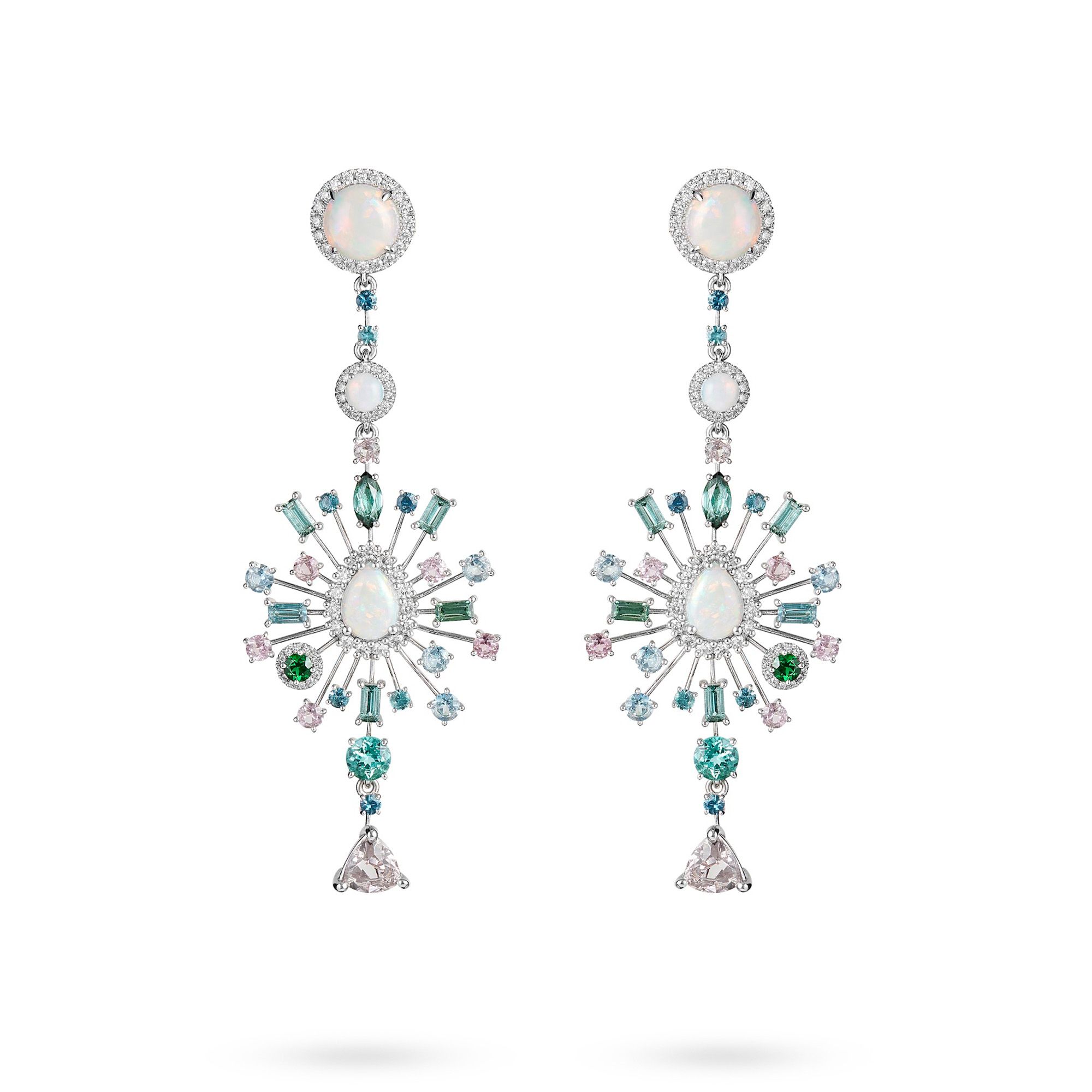 Kristallopal ca. 3,85 ct., Chrom Turmalin ca. 0,25 ct., Turmalin ca. 3,70 ct., Morganit ca. 1,40 ct., Aquamarin ca. 0,70 ct., weiße Diamanten ca. 1,05 ct.
