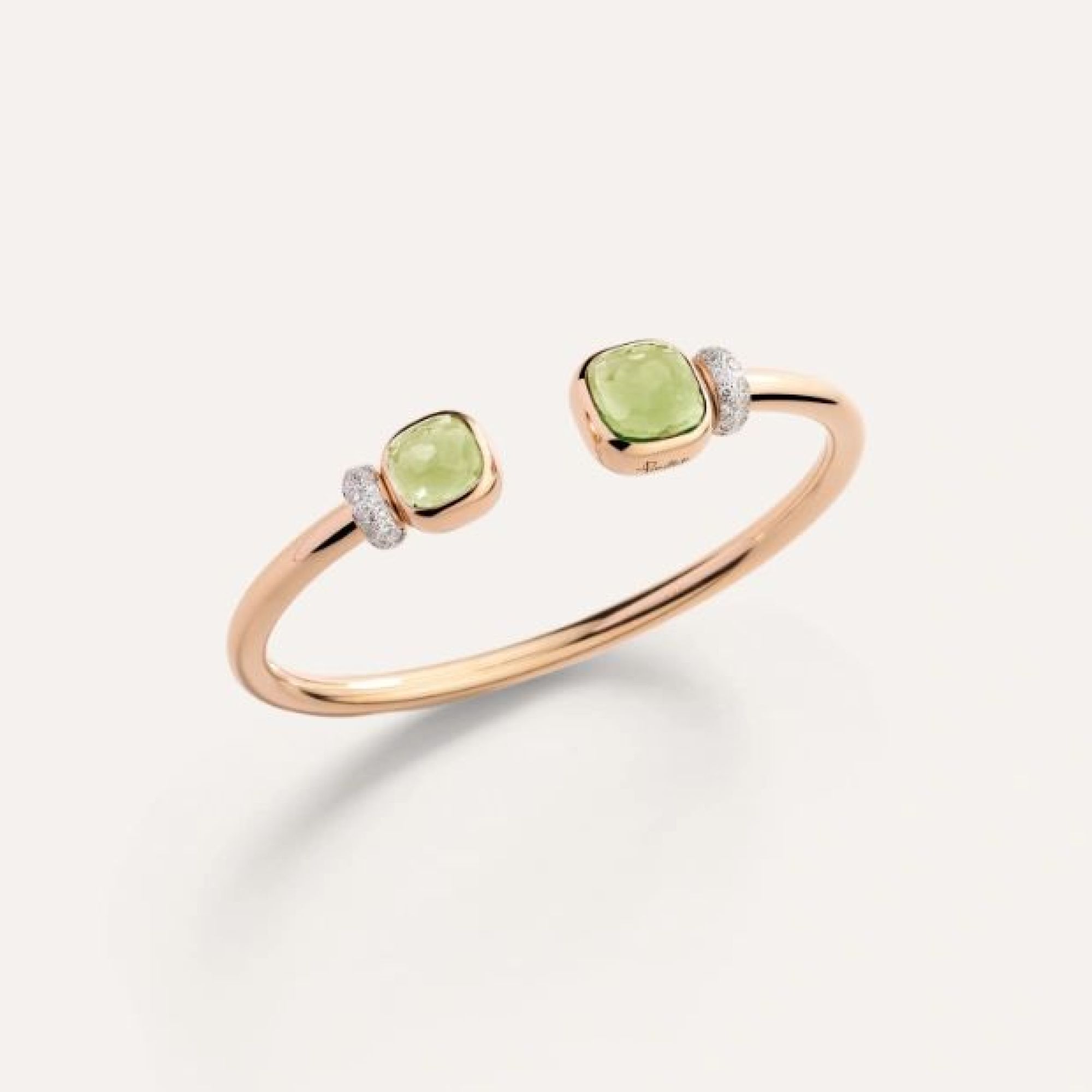 Die lebhaften Farben und die asymmetrischen Steingrößen sind Motive des Nudo-Designs, die in dieser sehr modernen Version des klassischen Armreifs zu neuem Leben erwachen. Ein starrer, offener Armreif, der das Handgelenk umschließt und zwei leuchtende Prasiolith-Edelsteine zur Schau stellt, passt immer und ist leicht zu kombinieren.