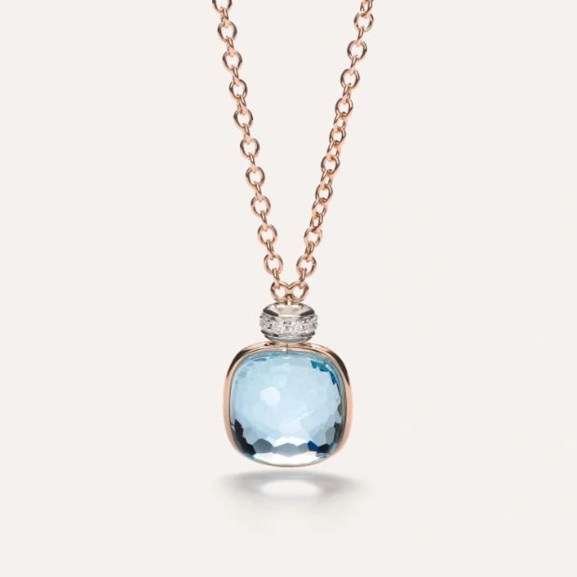 Halskette mit Anhänger aus 18 Kt Rosé- und Weißgold mit 1 himmelblauen Topas (≈12.9 ct) und 10 weißen Diamanten (≈0.1 ct) auf weiß rhodiniertem 18 Kt Weißgold.