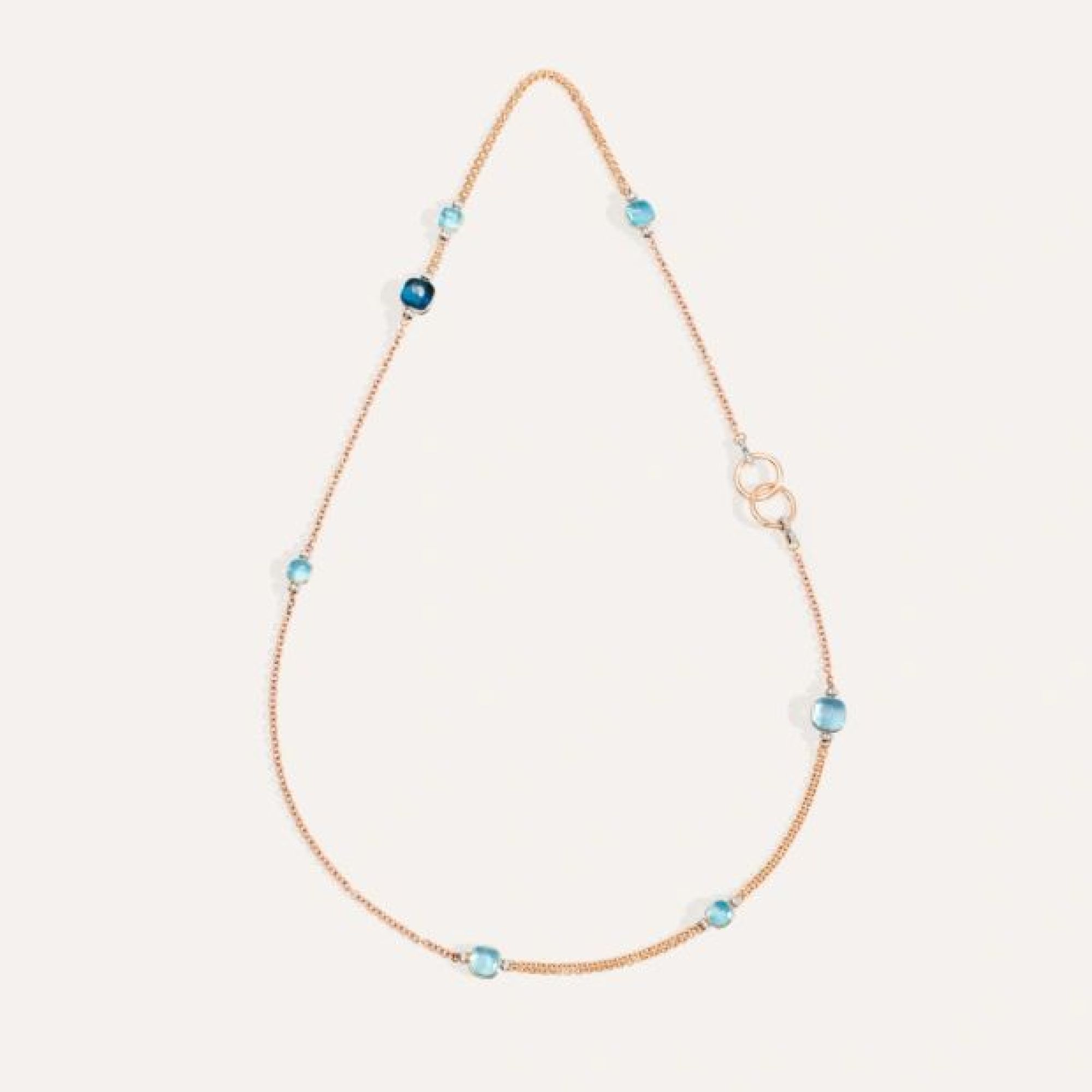 Erstmals erstrahlt NUDO in einer Halskette, die auf drei Arten getragen werden kann: als klassische Sautoir- oder als Lariat-Kette mit Anhänger, oder zweireihig um den Hals geschlungen. Erstmals zeigen die NUDO-Steine den zweiseitigen „Clessidra“-Schliff, mit dem sich die ganze Kostbarkeit dieses Edelsteins entfaltet.