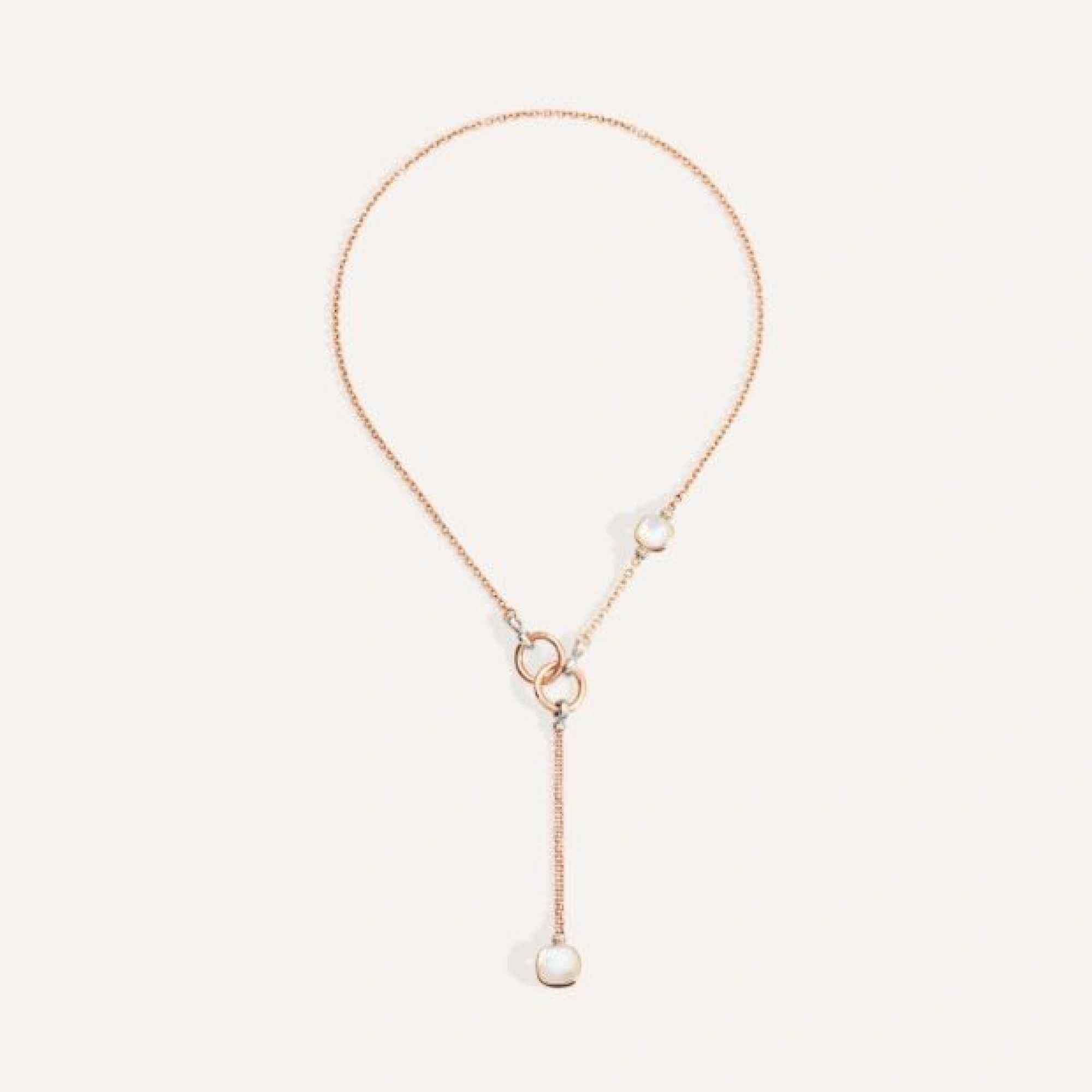 Erstmals erstrahlt NUDO in einer Halskette, die auf drei Arten getragen werden kann: als klassische Sautoir- oder als Lariat-Kette mit Anhänger, oder zweireihig um den Hals geschlungen. Erstmals zeigen die NUDO-Steine den zweiseitigen „Clessidra“-Schliff, mit dem sich die ganze Kostbarkeit dieses Edelsteins entfaltet.