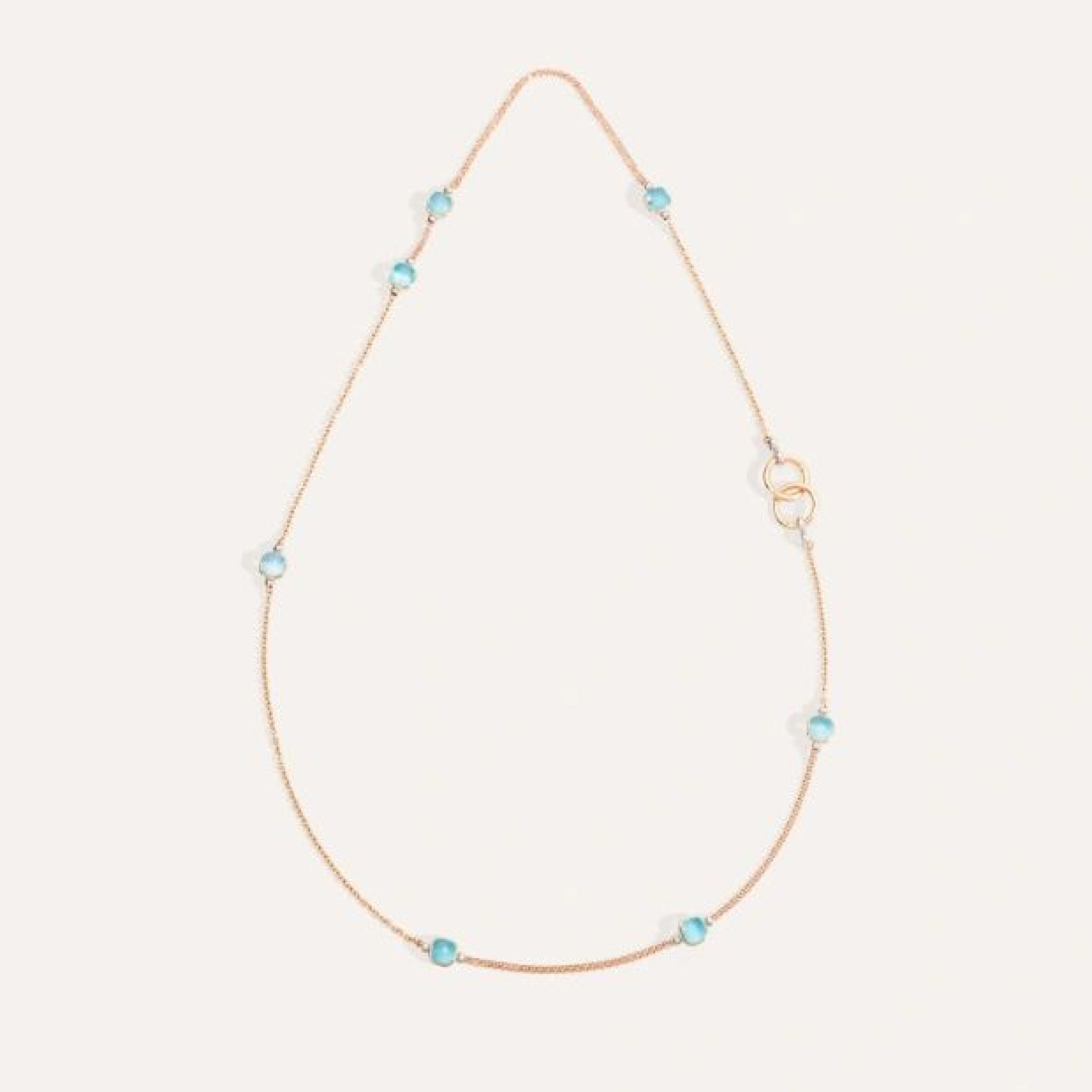 Erstmals erstrahlt NUDO in einer Halskette, die auf drei Arten getragen werden kann: als klassische Sautoir- oder als Lariat-Kette mit Anhänger, oder zweireihig um den Hals geschlungen. Erstmals zeigen die NUDO-Steine den zweiseitigen „Clessidra“-Schliff, mit dem sich die ganze Kostbarkeit dieses Edelsteins entfaltet.