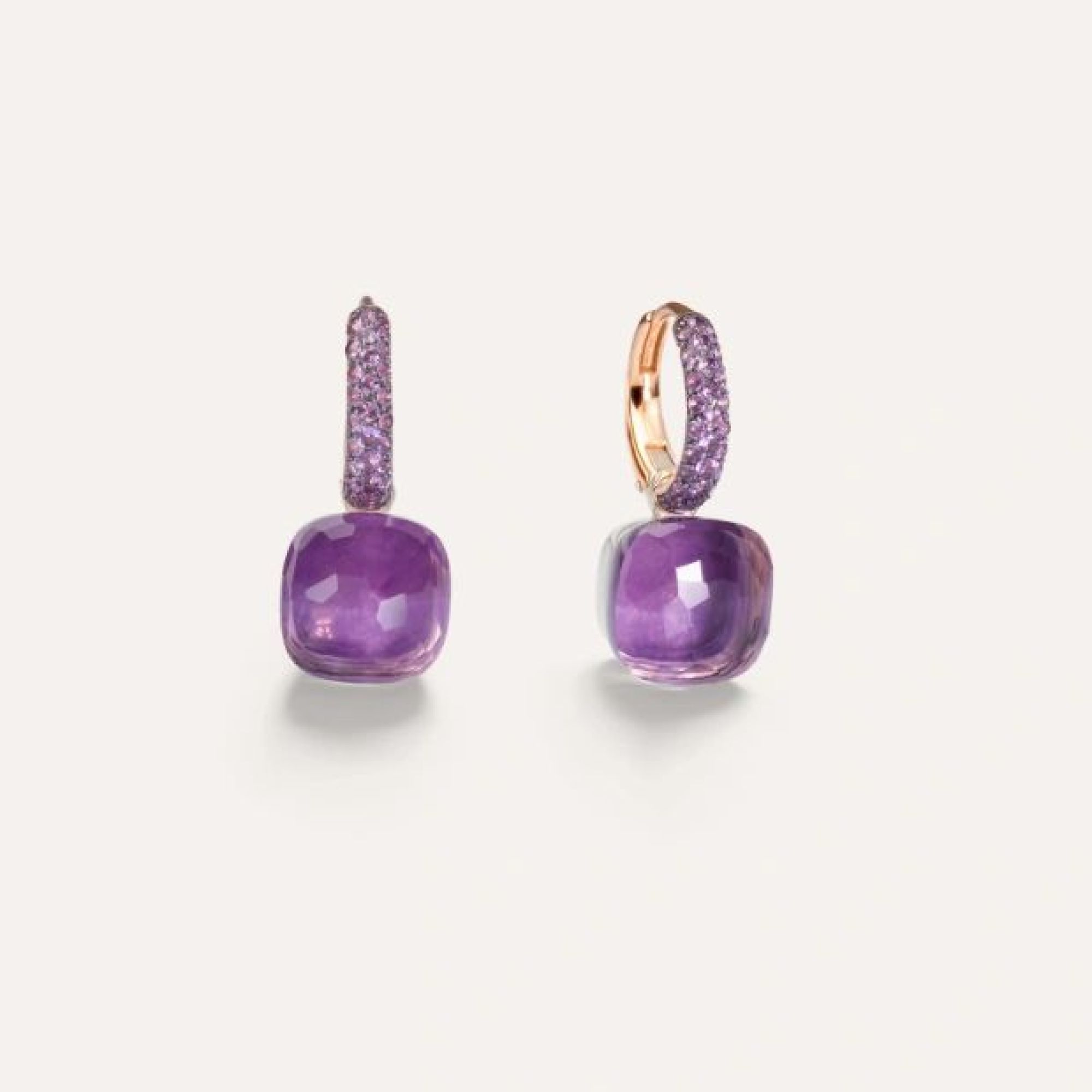 Nudo sind Schmuckstücke im unverwechselbaren Pomellato-Stil, die sich durch ihre leuchtenden Farben auszeichnen. Die Ohrringe mit Amethyst und Jade mit einem Amethyst-Pavé fallen durch ihre wunderschöne Kombination aus transparenten Edelsteinen und Halbedelsteinen auf.