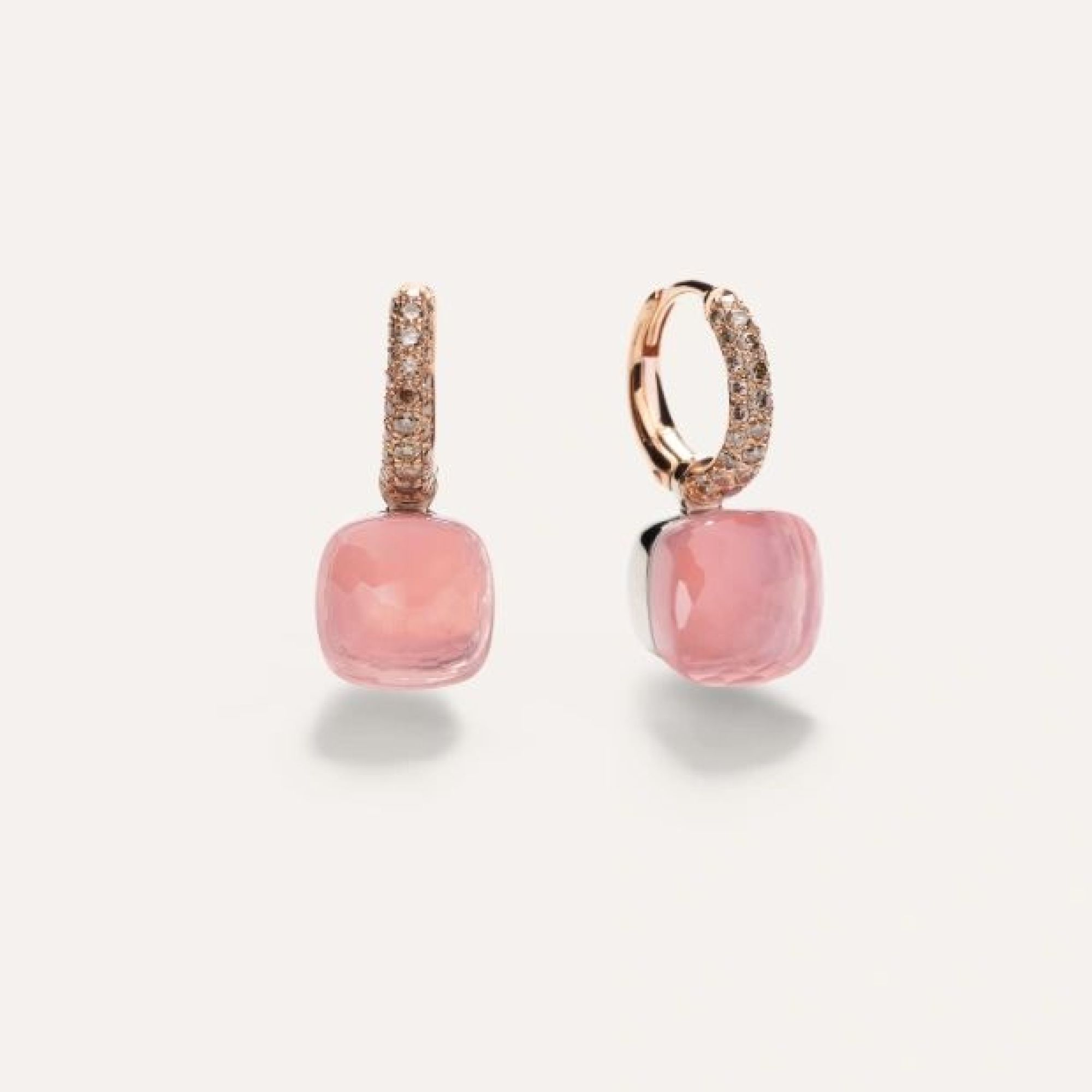 Ohrringe aus 18 Kt Rosé- und Weißgold mit 2 Rosenquarzen, 2 Chalcedonen (≈14.8 ct) und 56 braunen Diamanten (≈0.5 ct).