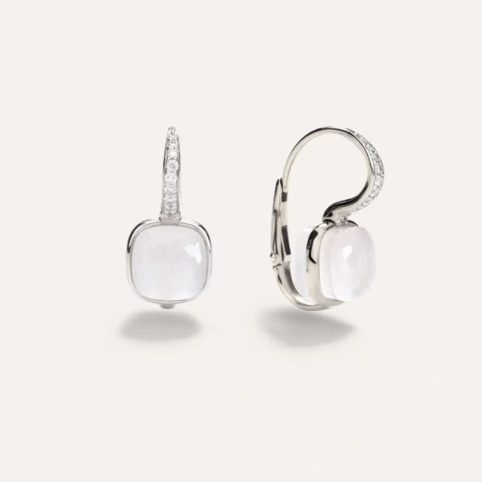 Immer auf der Suche nach Möglichkeiten, die innere Schönheit von Edelsteinen zur Geltung zu bringen, präsentiert die Nudo Milky Kollektion jetzt einen durchscheinenden cremefarbenen weißen Quarz. Die Ohrringe sind in Weißgold gefasst und mit Diamanten verziert. Zum ersten Mal verwendet Pomellato Mangan-Weißgold, eine neue Legierung, die ein länger schön bleibendes, helleres Weißgold ergibt.
