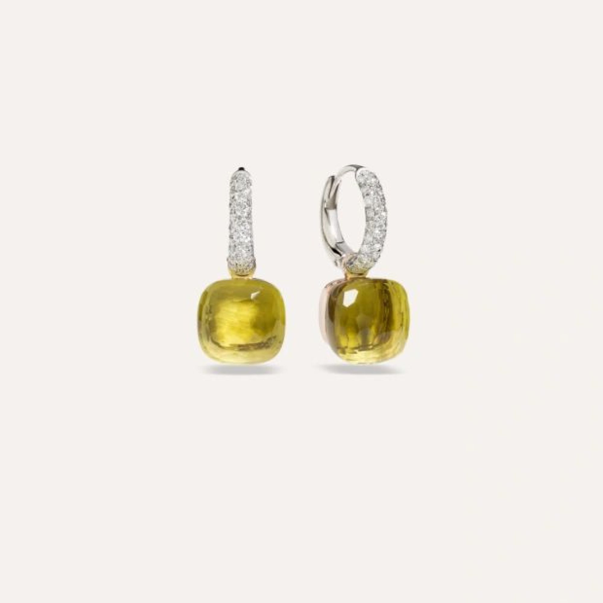 Ohrringe aus 18 Kt Weiß- und Roségold mit 2 Zitronenquarzen (≈13 ct) und 56 weißen Diamanten (≈0.5 ct) auf weiß rhodiniertem 18 Kt Weißgold.