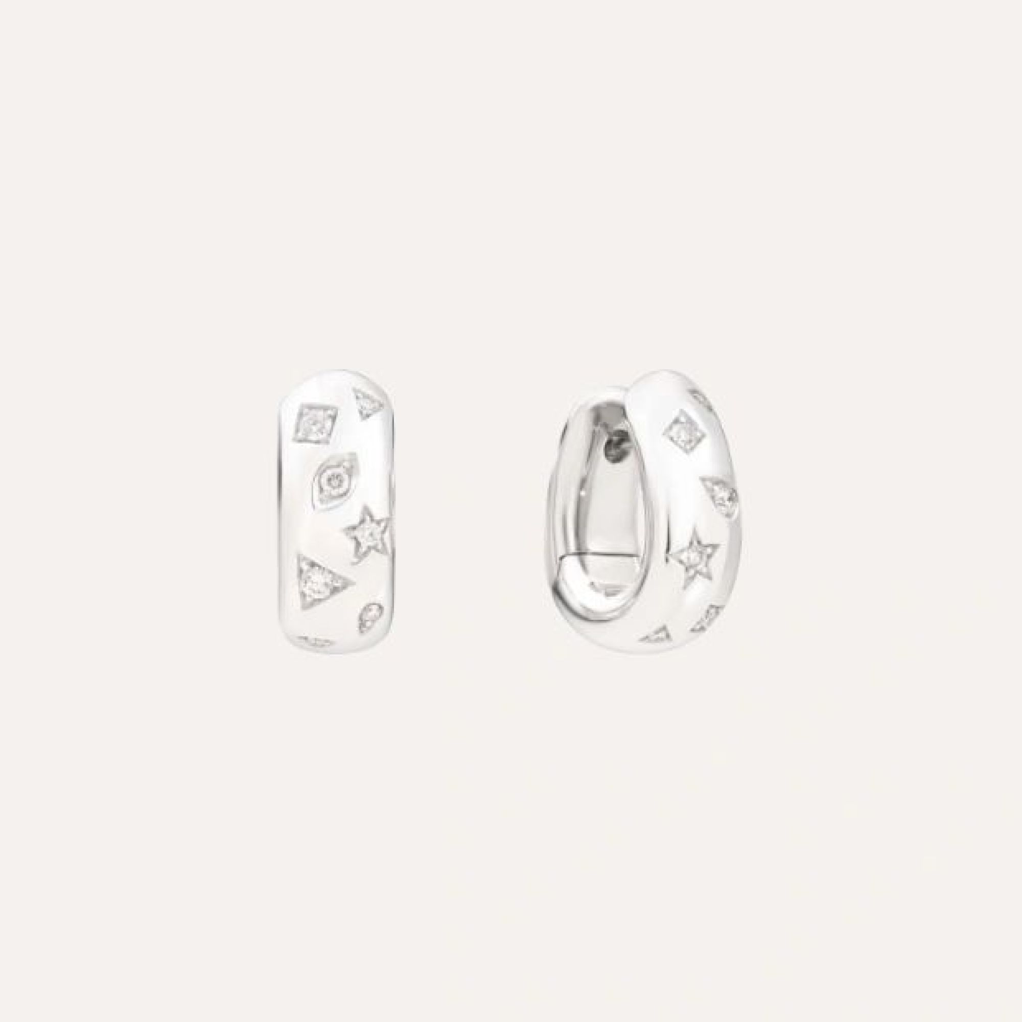 Die 13 weißen Diamanten in den verspielten Formen von Sternen, Dreiecken und Quadraten lassen die roségoldenen Ohrringe der Iconica-Kollektion, die sich mit ihren weichen Formen an das Ohrläppchen schmiegen, erstrahlen.