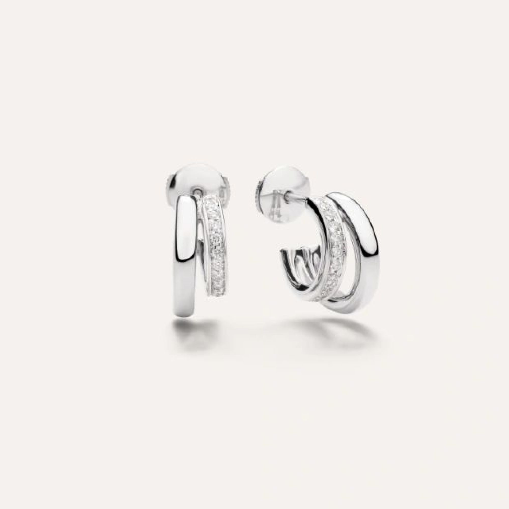 Der Stil von Pomellato Together ist traditionsbewusst und doch markant und zeitgemäß. Die raffinierten Volumina sind das Markenzeichen von Pomellato. Die Ohrringe mit doppelter Schlaufe zeigen die schlichte Mailänder Eleganz von ihrer besten Seite. Aus Weiß gold und Diamanten, die als unvergängliche Botschafter der Verbundenheit gelten.