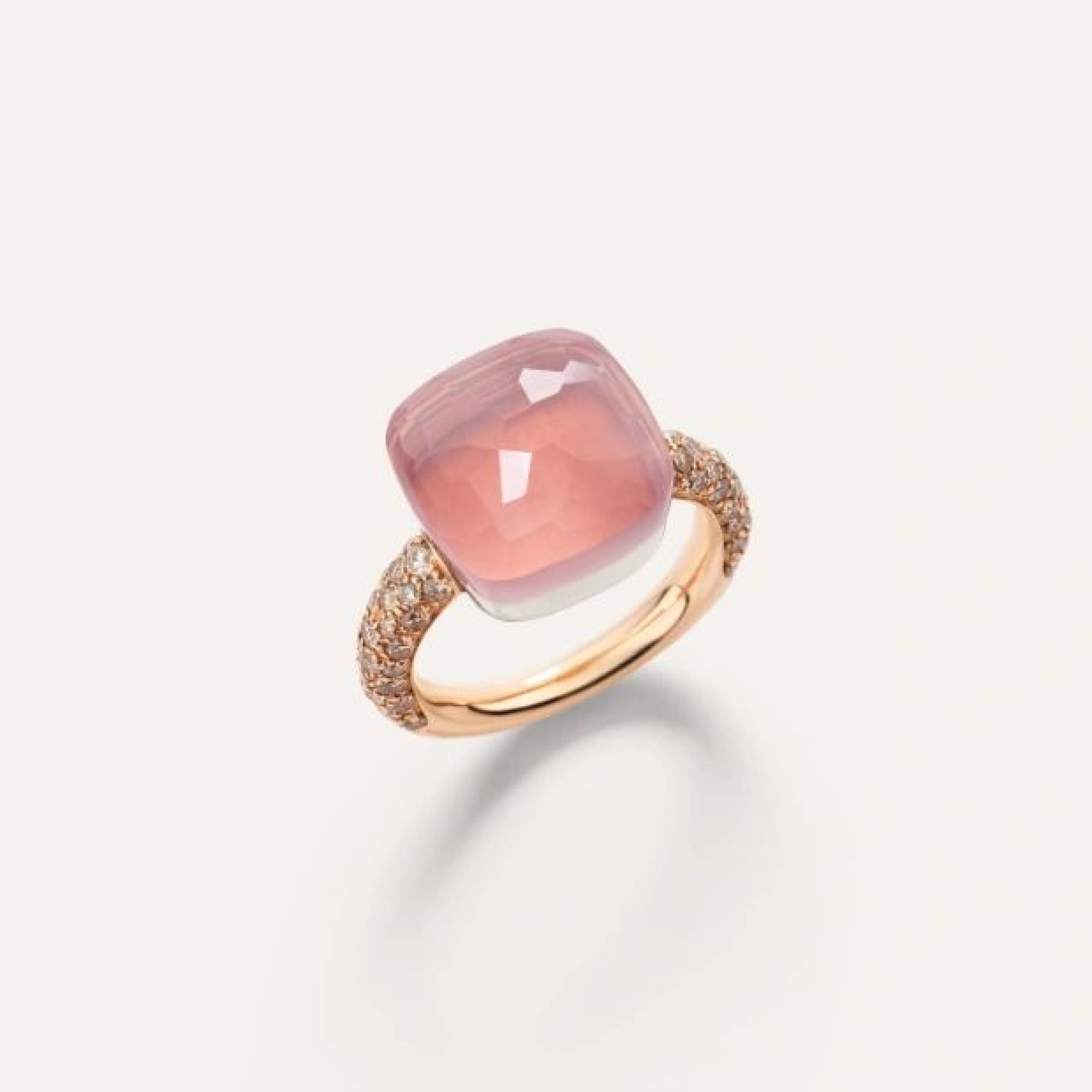 Ring aus 18 Kt Rosé- und Weißgold mit 1 Rosenquarz, 1 Chalcedon (≈11 ct) und 58 braunen Diamanten (≈0.7 ct).