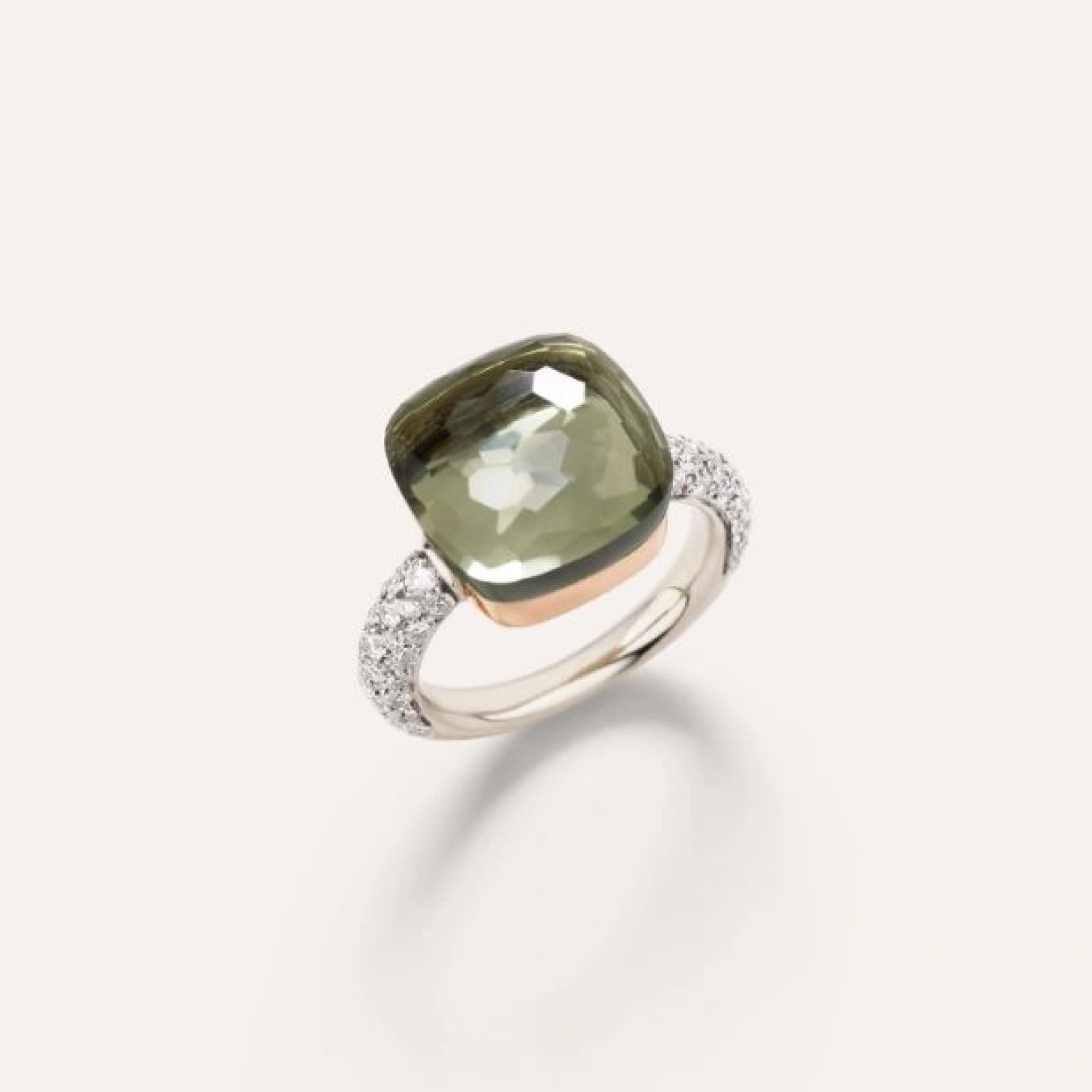 Ring aus 18 Kt Weiß- und Roségold mit 1 Prasiolith (≈10.9 ct) und 58 weißen Diamanten (≈0.7 ct) auf weiß rhodiniertem 18 Kt Weißgold.