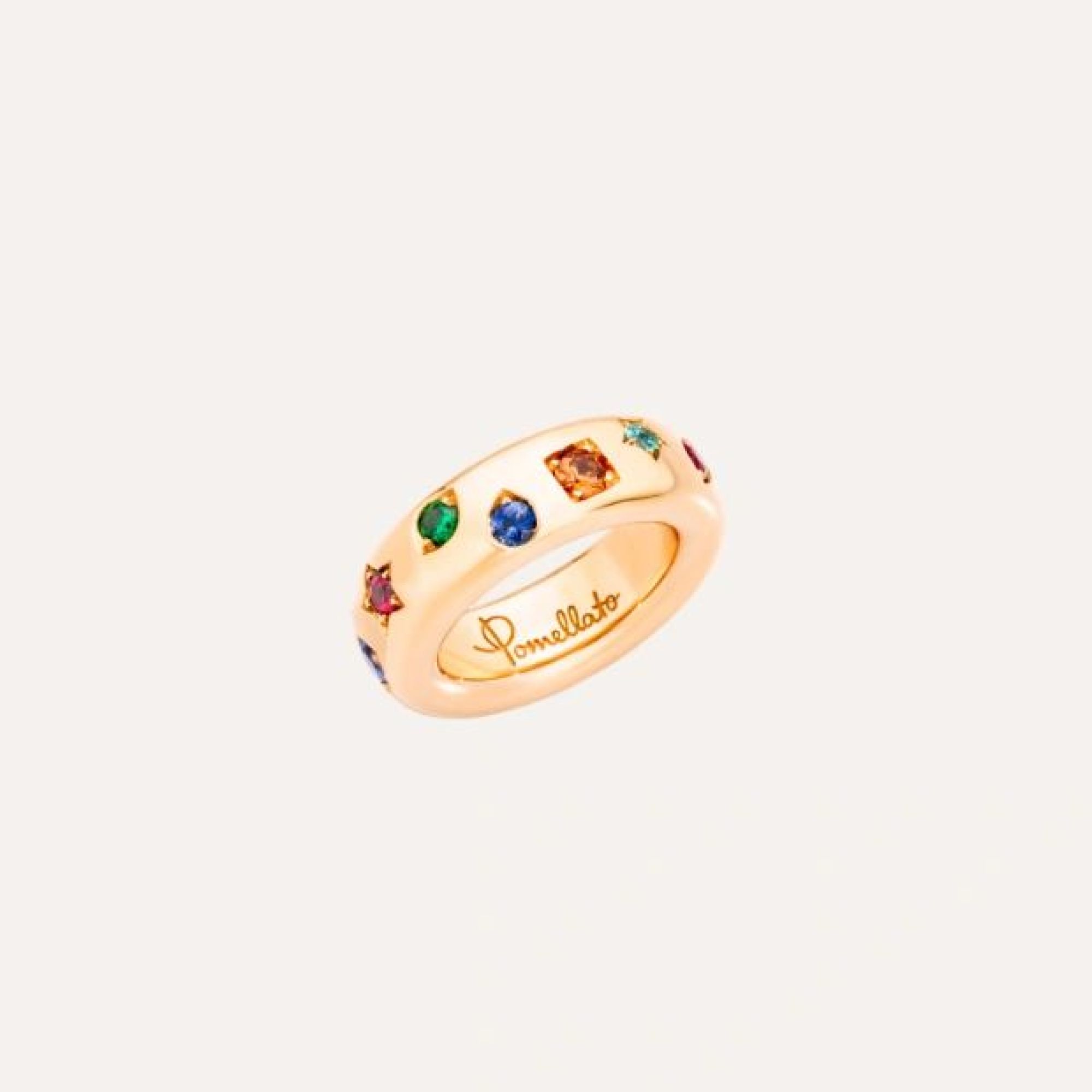 Ring aus 18 Kt Roségold mit 2 behandelten orangefarbenen Saphiren (≈0.3 ct), 1 rosa Turmalin (≈0.1 ct), 1 Peridot (≈0.2 ct), 1 Rubin (≈0.2 ct), 1 blauen Zirkon (≈0.1 ct), 2 blauen Saphiren (≈0.3 ct), 1 Demantoid (≈0.1 ct), 1 roten Spinell (≈0.1 ct), 2 Tansaniten (≈0.3 ct) und 1 Tsavorit (≈0.2 ct).