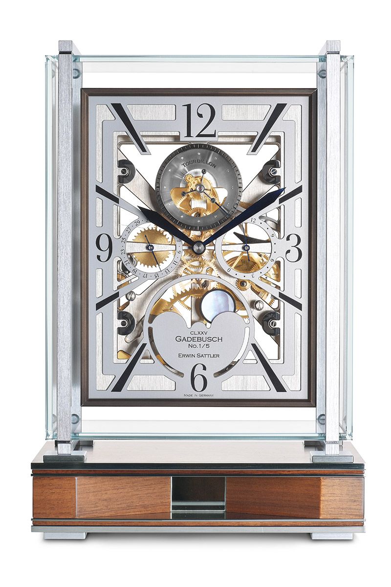 36 x 24 x 14 cm, Kaliber 1399-1, Glasgehäuse, Nussbaumsockel mit Metallintarsien, eloxiertes, skelettiertes Zifferblatt, Gangdauer 15 Tage, limitiert auf 5 Exemplare.